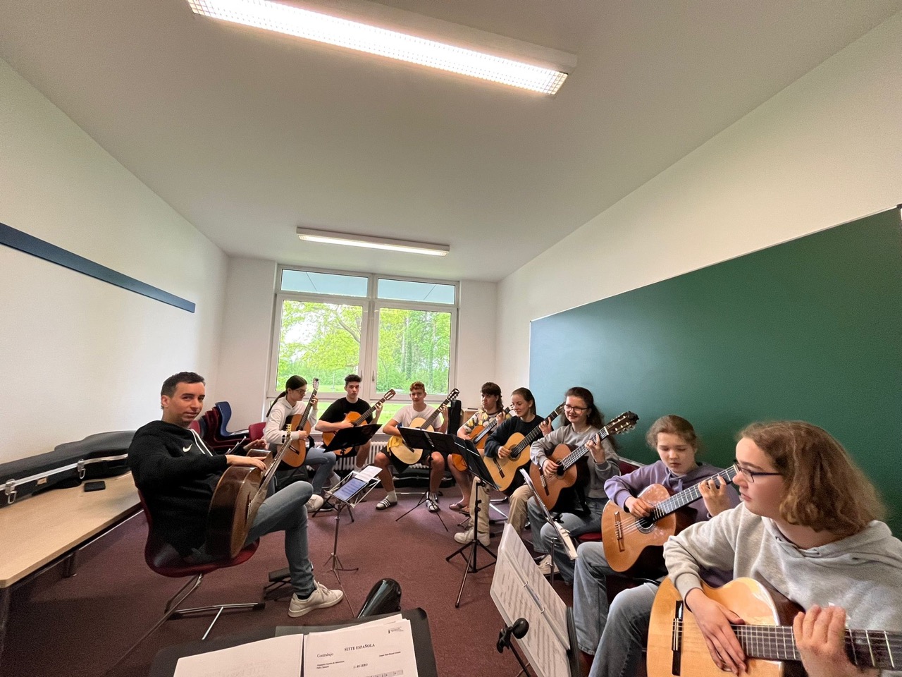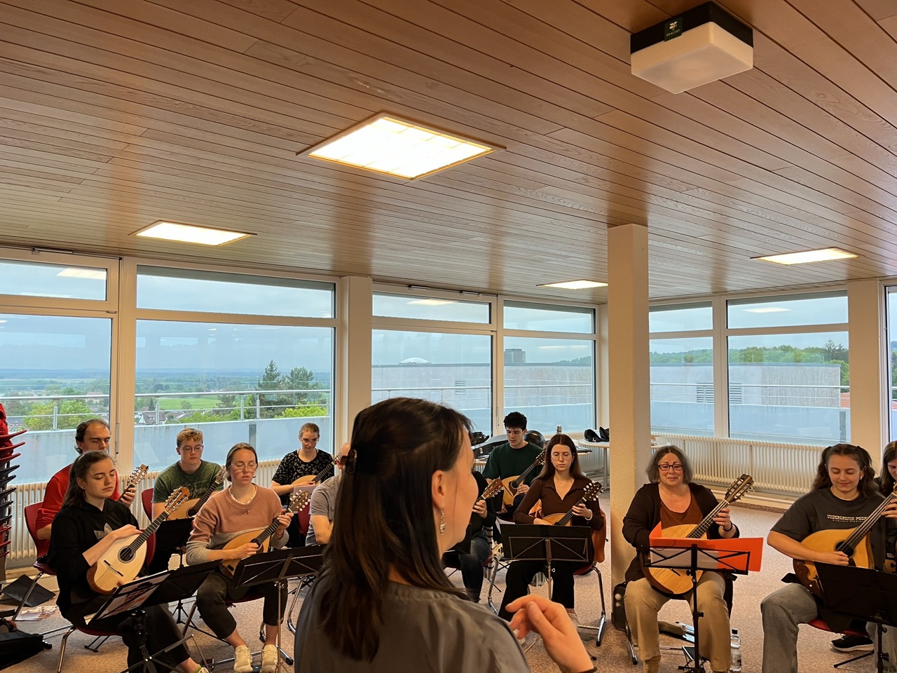 Die Arbeitsphasen wechselten sich dabei in Stimm- und Ensembleproben sowie Orchestereinheiten ab. Hierbei kam unser eingespieltes Dozententeam mit Birgit Wendel (Mandoline, Mandola), Jonas Khalil (Gitarre), Antonia Platzdasch (Mandoline) sowie Flavius Wagner (Gitarre) zum Einsatz. Auch die Saitenwechsler (Gitarrist:innen, die auf Mandoline umlernten) konnten ihr Erlerntes und (zu Hause) Geübtes bei Birgits Einheiten vertiefen.