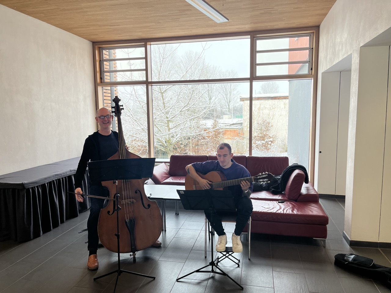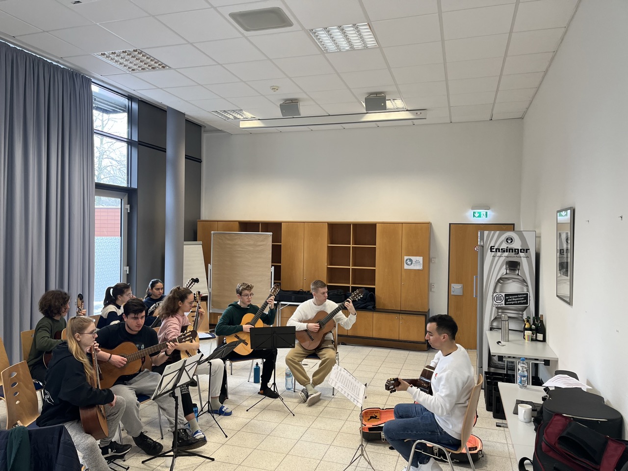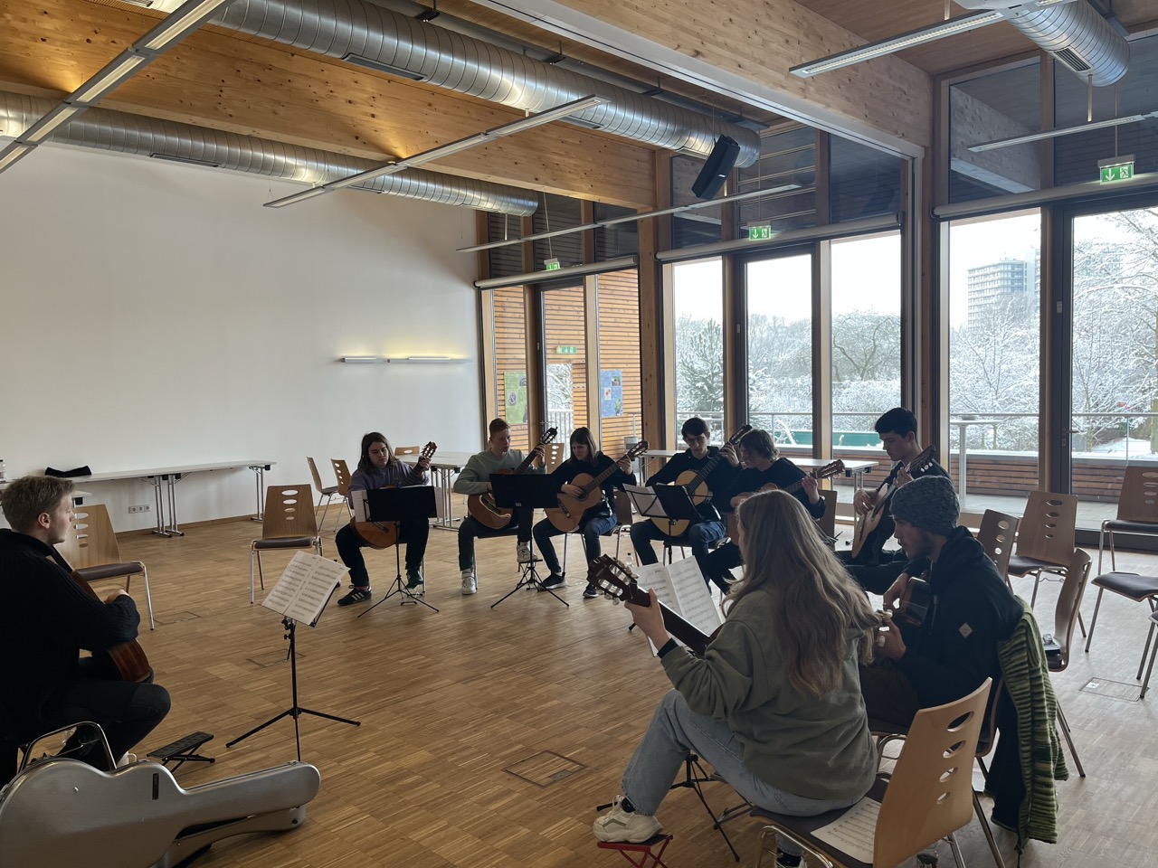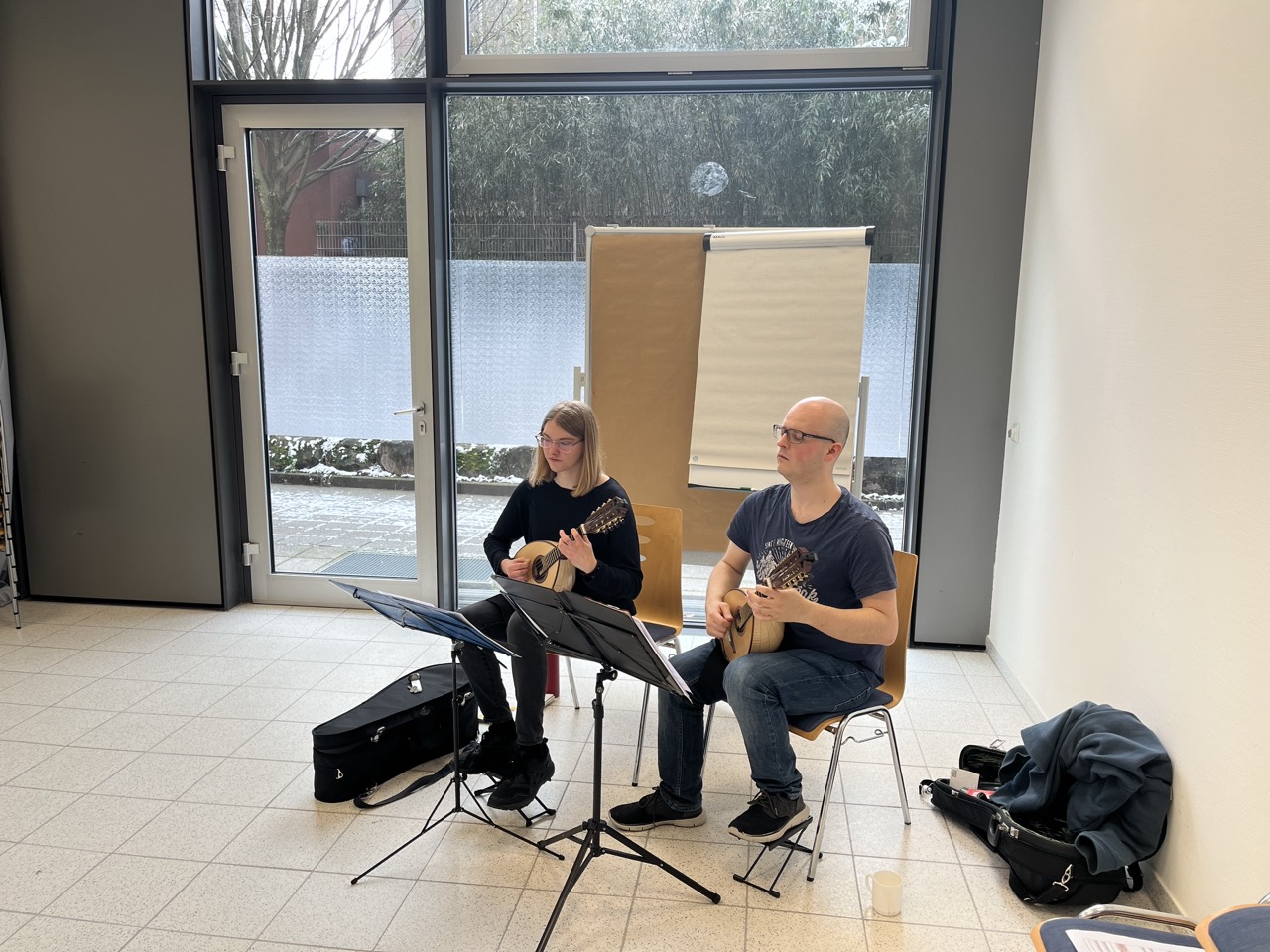 Der Anreisetag begann traditionell mit einer ersten Probe und ein gegenseitiges Herantasten: Wie klingt ein Zupforchester, welche Dynamik (im Gegensatz zur Blasmusik, die Isabel gewohnt ist) ist möglich, etc. Der Samstag startete nach ausgiebigem Frühstück mit Stimmproben, in welchen technische und vor allem rhythmische Arbeit mit unserem eingespielten Dozenten:innenteam stattfand. Die neuen Stücke, wie beispielsweise „The Earl of Essex his Galliard“, „Lacrimae Antiquae“ und „Sir John Souch his Galliard“ von John Dowland oder Liberty Bell von John Philip Sousa wurden schrittweise analysiert und einstudiert. Die Stimmproben wurden wie immer kompetent, auf hohem Niveau und dabei immer mit guter Stimmung von Birgit Wendel (Mandoline, Mandola), Jonas Khalil (Gitarre), Stefan Koch-Roos (Kontrabass), Antonia Platzdasch (Mandoline) sowie Flavius Wagner (Gitarre) betreut.