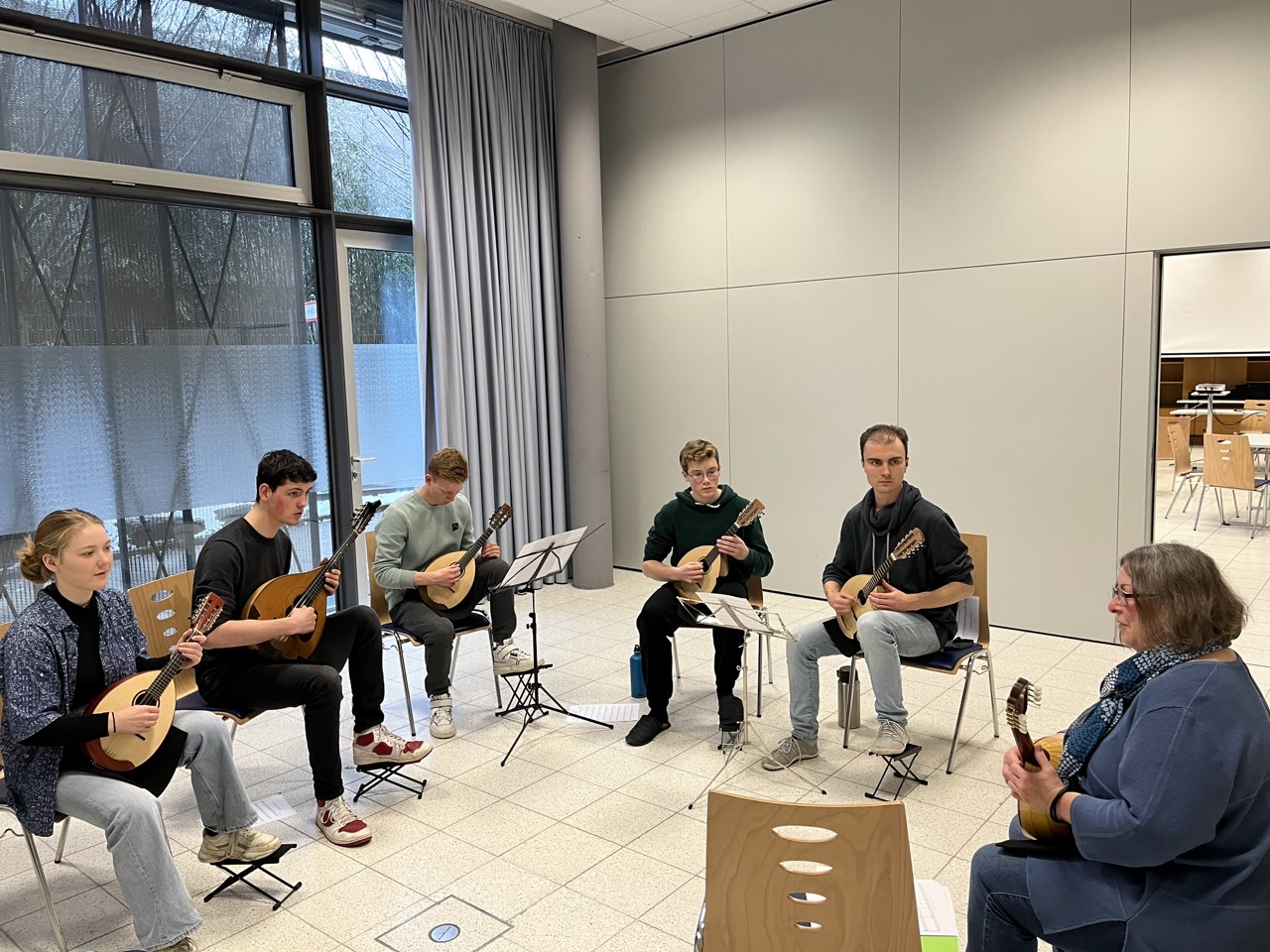 Nach dem Mittagessen erfolgte die zweite Gesamtprobe, in der die Ergebnisse der Stimmproben zusammengesetzt worden sind und schon erste Fortschritte aufzeigten. Parallel fanden sich einige Spieler:innen in einem anderen Raum der Jugendherberge zum „Saitenwechsler-Workshop“ mit Birgit Wendel zusammen. Dieser Workshop bietet die Möglichkeit für Gitarrenspieler:innen Einblicke in das Instrument Mandoline zu erhalten und gegebenenfalls „umzusteigen“. Das Ziel ist hierbei die Aufstellung der Mandolinen im JZObw zu erweitern und damit für mehr „Ausgewogenheit“ im Klangbild zu sorgen.