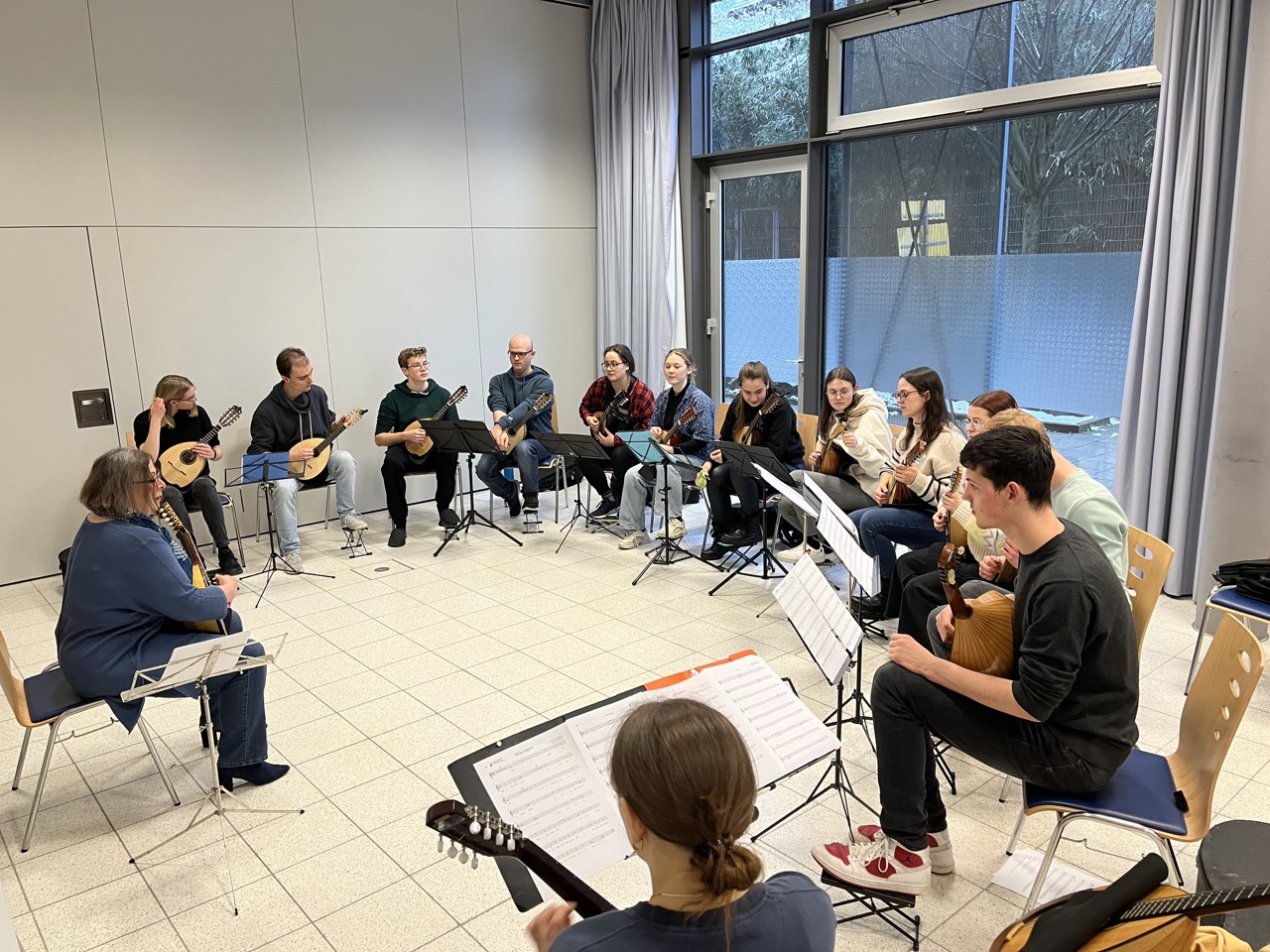 Innerhalb der ersten Workshopeinheit lernten die Spieler:innen die wichtigsten Handgriffe und Techniken, sodass sie am Ende der Einheit bereits ihr erstes Stück im Gesamtorchester spielen konnten und dabei freudig in ihren neuen Stimmen begrüßt wurden. Nach der Kaffeepause waren Gitarren und Mandolinen/Mandolen (die Umsteiger waren bereits integriert) in zwei Gruppen eingeteilt und konnten jeweils weiter an ihren Stücken feilen. Lange Proben erfordern auch andere „Haltungen“ – so lockerten die Spieler:innen ihre Muskulatur unter Anleitung von Antonia etwas auf.